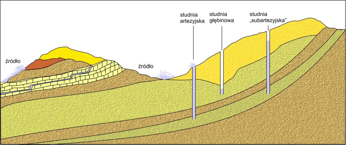 W przypadku swobodnego zwierciadła wody gruntowej jej ruch możliwy jest dzięki pochyleniu zwierciadła. Woda gruntowa znajdująca się pod ciśnieniem między warstwami nieprzepuszczalnymi po wykonaniu otworu podnosi się w nim. Jeżeli ciśnienie jest tak duże, że wypływa nad powierzchnię terenu wtedy nazywana jest artezyjską, natomiast wodą subartezyjską jest ta, której podniesione w otworze zwierciadło nie osiąga powierzchni terenu.
