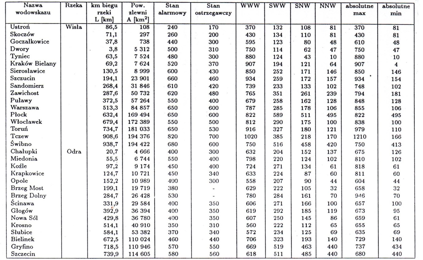 Tab.1. Stany charakterystyczne (naturalne i umowne) dla wybranych profili Wisły i Odry [1]