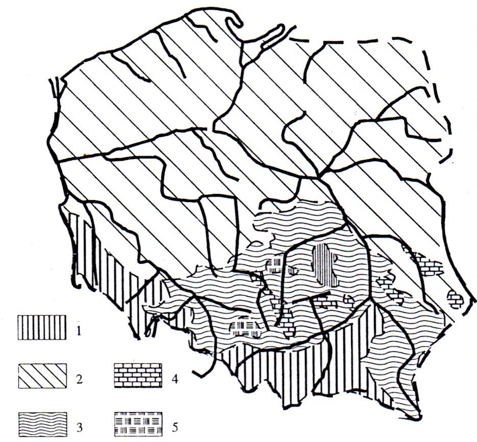 Rys. 4. Dominujące typy wezbrań w Polsce [1]: 1- wezbrania opadowe, 2- wezbrania roztopowe, 3- mieszany typ wezbrań, 4- tereny występowania zjawisk krasowych, 5- tereny z wyraźnym wpływem czynników antropogenicznych na dopływ rzeczny