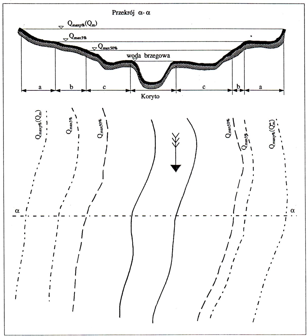 Strefa „a” – małego zagrożenia obejmuje obszar pomiędzy istniejącymi walami przeciwpowodziowymi lub gdy ich brak, między linią zalewu wodami miarodajnymi, a linią zalewu wywołanego przepływem maksymalnym rocznym o prawdopodobieństwie p=5% . Pod pojęciem przepływów miarodajnych rozumiemy w tym przypadku przepływ maksymalny roczny o określonym prawdopodobieństwie przyjmowany jak przy projektowaniu wałów w zależności od rodzaju terenu chronionego. Strefa „b" — średniego zagrożenia, rozciąga się pomiędzy liniami zalewu wywołanego przepływami maksymalnymi rocznymi o prawdopodobieństwie p = 5% i p = 50%. Strefa „c" — wielkiego zagrożenia, obejmuje obszar położony między liniami zalewu spowodowanego przepływami maksymalnymi rocznymi o prawdopodobieństwie wystąpienia p = 50%, a linią wody brzegowej. Prawdopodobieństwa p = 50% i p = 5% odpowiadają kolejno: częstotliwości pojawienia się raz na 2 lata i 20 lat. Granice tych stref wyznacza się na mapach na podstawie profili podłużnych przepływów prawdopodobnych i profili poziomów wody odpowiadających tym przepływom. Ustalono zasadę lokalizacji obiektów w poszczególnych strefach zagrożeń. W strefie „a", w przypadku rzek obwałowanych można lokalizować tereny rekreacyjne parki i zieleńce, dopuszcza się uprawy rolne (z wyjątkiem pasa ochronnego wału o szerokości 10 m od jego stopy). W przypadku rzek nieobwałowanych zabrania się lokalizacji zakładów przemysłowych, budynków mieszkalnych i gospodarczych. Istniejące w tej strefie zabudowania mieszkalne powinny być przeniesione na tereny położone wyżej. Tereny w strefie „b" zarówno dla rzek obwałowanych jak i nieobwałowanych mogą być zagospodarowane w pierwszym przypadku jako użytki zielone, w drugim jako grunty orne. Natomiast budynki gospodarcze i mieszkalne są w tej strefie niedopuszczalne. W przypadku rzek obwałowanych, w miastach dopuszcza się tereny rekreacyjne parki i zieleńce o ile nie będą one utrudniały spływu wielkiej wody. W strefie „c" doliny rzeczne zarówno obwałowane jak i nieobwałowane powinny być zagospodarowane jako użytki zielone, łąki i pastwiska. Nie dopuszcza się tu upraw rolnych. Tereny te nie mogą być zabudowane, a istniejące już budowle nie regulacyjne mogące zakłócić przepływy kulminacyjne powinny być z tej strefy usunięte z wywłaszczaniem. W 1987 r. w CBSiPBW „Hydroprojekt" opracowano projekt nowych wytycznych lokalizacji obiektów na terenach zagrożonych powodziami wraz z odmiennym podziałem na strefy zagrożenia powodziowego. Ustalono zasady lokalizacji w poszczególnych strefach obiektów usystematyzowanych w 3 grupach: A, B, C wg sfer produkcji oraz gałęzi gospodarczych i społecznych zgodnie z klasyfikacją gospodarki narodowej opracowaną przez GUS. W zasadzie w każdych zaleceniach (ONZ z 1976) stwierdza się, że w strefie największego zagrożenia (odpowiednik strefy „c"), nie należy lokalizować nowych obiektów. Natomiast usytuowane tam budynki oraz istniejące w korycie mosty, porty itp. powinny być odpowiednio zabezpieczone przed wodą płynącą z dużą prędkością w czasie powodzi. Jeżeli jednak występuje konieczność wznoszenia na tych terenach budynków, to należy rozpatrzeć możliwość zabudowy specjalnej i posadowienia budowli na palach, nasypach itp. Pamiętać należy, by przekrój poprzeczny doliny do poziomu WW był odpowiednio powiększony o powierzchnię zajmowaną przez nowy obiekt. Przekroje WW przed i po zabudowie powinny być sobie równe. Najwłaściwszym wykorzystaniem terenów zaliczanych do tej strefy jest przeznaczenie ich do celów rekreacyjnych jako tereny otwarte: place zabaw, parki, boiska lub jako łąki i pastwiska. W strefie mniejszego niż poprzednio zagrożenia (odpowiadającej strefie „b"), gdzie, nie ma zakazu zabudowy, przy wznoszeniu nowych obiektów muszą być uwzględniane pewne wymogi budowlane, np. konstrukcje fundamentów oraz poziomy piwnic powinny być tak projektowane, by woda nie niszczyła tych obiektów. Również w następnej strefie, umiarkowanego zagrożenia, odpowiadającej strefie „a" nie ma formalnych ograniczeń zabudowy, jednak przyszli użytkownicy obiektów powinni być ostrzeżeni o możliwości wystąpienia powodzi. Poldery są to tereny okresowo zalewowe, służące zmniejszeniu szczytu fal wezbraniowych przez rozlanie części wielkich wód z rzeki i wprowadzeniu jej na obszary retencyjne. Uwagi o polderach podsumować można w ten sposób, że obecne trendy wskazują celowość rozpatrywania możliwości stosowania tych obiektów tam gdzie istnieją szczególnie duże pojemności retencyjne i duże odstępy między wałami rozdzielczymi, korzystne warunki topograficzne i geologiczne dla upustów, gospodarcze słabo wykorzystywane rolniczo i społeczne. Przez retencję rozumie się zwykle zabiegi mające na celu opóźnienie spływu z terenu rowów, rzek, zbiorników i jezior dzięki rożnego rodzaju zabiegom rolniczym i leśnym oraz dzięki urządzeniom technicznym. Przykładowe relacje pomiędzy stanami charakterystycznymi naturalnymi i umownymi (konwencjonalnymi) zawiera tab.1.