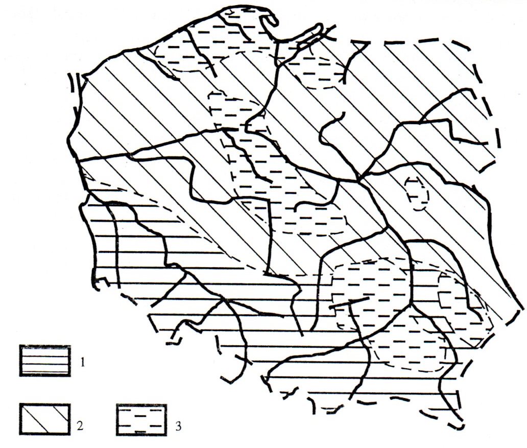 Rys. 3. Rejonizacja powodzi w Polsce [1]: 1- obszary najczęściej nawiedzane przez powodzie opadowe, 2- obszary najczęściej nawiedzane przez powodzie roztopowe, 3- obszary najczęstszego występowania powodzi letnich spowodowanych przez krótkotrwałe deszcze nawalne.